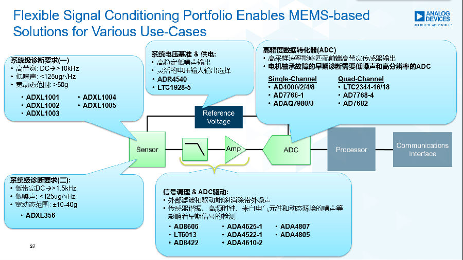 ADI除了MEM加速度傳感器,還可以在整個信號采集信號鏈上提供完整解決方案: