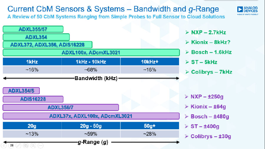 經(jīng)過對比不難發(fā)現(xiàn),兩款傳感器在靈敏度上非常接近,而ADXL1002隨頻率的相移相對于對比產(chǎn)品要小一半,底噪上壓電陶瓷要比MEMS小一些。在成本方面,Eason介紹,壓電陶瓷比MEMS高出許多——100vs30。以下是ADI常用于振動監(jiān)測的加速度傳感器選型:
