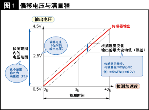 「滿量程」是指相對(duì)于可檢測的加速度,可輸出的全范圍的電壓。圖1表示GS1、GS2的傳感器的檢測范圍與輸出電壓。如圖所示,滿量程為4.5V。