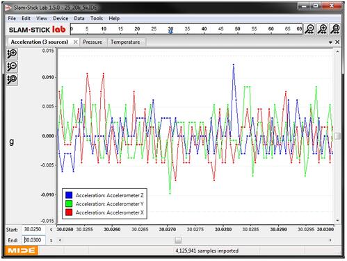 通常僅對數(shù)字輸出加速度計或結(jié)合了模數(shù)轉(zhuǎn)換器的系統(tǒng)給出加速度計的分辨率。分辨率通常會指定為位,然后可用于計算加速度單位的分辨率。例如,假設(shè)加速度計系統(tǒng)具有16位分辨率;這意味著它可以測量2 16(65,536)個加速度等級或等級。對于±100g的測量范圍,這等于0.003g(200/65536)的分辨率,這是最小的可測量加速度水平。在寬帶噪聲圖像中,數(shù)據(jù)是使用14位分辨率的±25 g加速度計生成的  (對于低于8.5 kHz的采樣率,傳感器的分辨率高達16位)。這也等于0.003g(50/214); 您會看到這些數(shù)據(jù)點始終至少間隔0.003g。