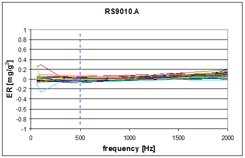 圖6: 在20 至 500Hz 和500 至 2000 Hz 頻率范圍,RS9010.A振動(dòng)整流誤差 < 100 μg/g2. 此圖形由37只不同的傳感器疊加而成