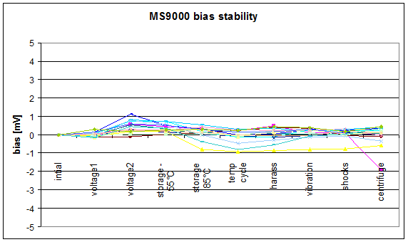 對于量程為±10g的測量,它們總的長期零偏穩(wěn)定性優(yōu)于7.5mg,對于量程±5g,優(yōu)于3.75mg,其標(biāo)度因數(shù)重復(fù)性優(yōu)于400ppm。圖1顯示了對于各種量程MS9000.D的一年零偏穩(wěn)定性的測量結(jié)果。該分析結(jié)果還包括:在85°時(shí)進(jìn)行10天的加速老化實(shí)驗(yàn),這對應(yīng)于18個(gè)月的標(biāo)準(zhǔn)壽命時(shí)間,以及對加速度傳感器為期0.2毫秒,1000g的從六個(gè)方向進(jìn)行的沖擊。