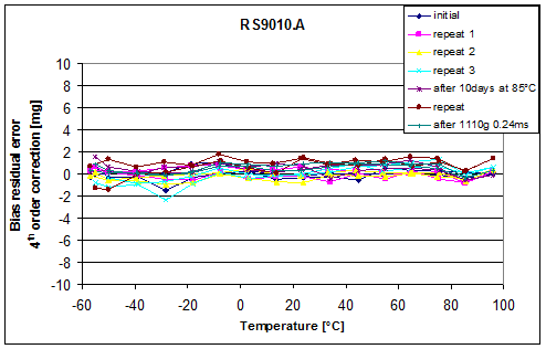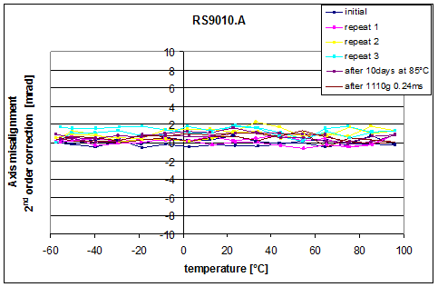 圖 5: 在整個(gè)溫度范圍的軸偏穩(wěn)定性(經(jīng)過2階多項(xiàng)式校正之后), 沖擊和加速老化