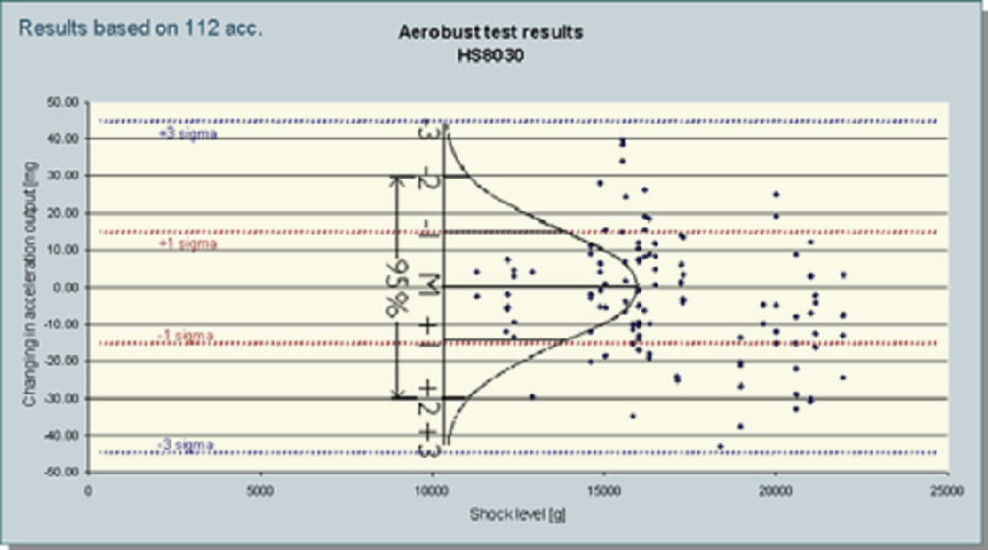 對加速度器最終的考驗是結合沙地軟著陸的155毫米榴彈實地發(fā)射測試。安裝在IMU的加速度計能成功承受住11’800g到19’500g的沖擊力。對發(fā)射過程中最高沖擊力,加速度傳感器表現(xiàn)出良好的耐受性和極小的偏離。