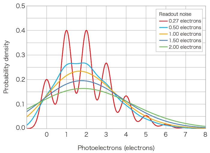 如下所示,對于 0.5 個(gè)電子及以上的讀出噪聲,將失去檢測單個(gè)光電子的能力。