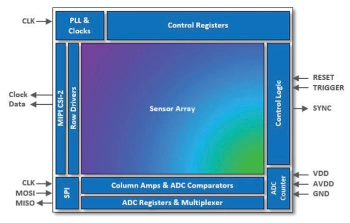 該接口包含一個(gè) 4 通道MIPI CSI-2輸出接口,以 1.5 Gbps/通道運(yùn)行,以及一個(gè) SPI 40 MHz 控制接口。Hawkeye 在 120 fps 下使用低于 750 mW,工作溫度范圍為 -40 ℃ 至 +85 ℃(否則稱為工業(yè)應(yīng)用)。