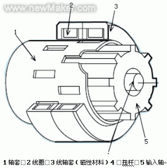 如圖4所示為非接觸式扭矩傳感器的典型結(jié)構(gòu)。輸入軸和輸出軸由扭桿連接起來(lái),輸入軸上有花鍵,輸出軸上有鍵槽。當(dāng)扭桿受方向盤(pán)的轉(zhuǎn)動(dòng)力矩作用發(fā)生扭轉(zhuǎn)時(shí),輸入軸上的花鍵和輸出軸上鍵槽之間的相對(duì)位置就被改變了。花鍵和鍵槽的相對(duì)位移改變量等于扭轉(zhuǎn)桿的扭轉(zhuǎn)量,使得花鍵上的磁感強(qiáng)度改變,磁感強(qiáng)度的變化,通過(guò)線(xiàn)圈轉(zhuǎn)化為電壓信號(hào)。信號(hào)的高頻部分由檢測(cè)電路濾波,僅有扭矩信號(hào)部分被放大。非接觸扭矩傳感器由于采用的是非接觸的工作方式,因而壽命長(zhǎng)、可靠性高,不易受到磨損、有更小的延時(shí)、 受軸的偏轉(zhuǎn)和軸向偏移的影響更小,現(xiàn)在已經(jīng)廣泛用于轎車(chē)和輕型車(chē)中,是EPS傳感器的主流產(chǎn)品。