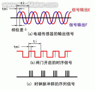 如圖5所示為相位差傳感方式來(lái)檢測(cè)扭矩的扭矩傳感器的結(jié)構(gòu)和測(cè)量原理圖,這種傳感器具有高精度,高重復(fù)性的特點(diǎn)。其測(cè)量原理為:在受扭軸的兩端各安上一個(gè)齒輪,對(duì)著齒面再各裝一個(gè)電磁傳感器,從傳感器上就能感應(yīng)出兩個(gè)與動(dòng)力軸非接觸的交流信號(hào)。取出其信號(hào)的相位差,在這兩個(gè)相位差之間,插入由晶體震蕩器產(chǎn)生的高精度,高穩(wěn)定的時(shí)鐘信號(hào)。以這個(gè)時(shí)鐘信號(hào)為基準(zhǔn),巧妙運(yùn)用數(shù)字信號(hào)處理技術(shù)就能精確地測(cè)出所承受的扭矩。