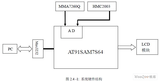 本系統(tǒng)的硬件結構如圖2.4 -1 所示。 由于At91sam7s64 具有片上A/D 轉換器而且具有8 選1 模擬復用器,使得MMA7620Q 和HMC2003 可以直接與微控制器相連而不必外加A/D 轉換器和復用器,不僅降低了系統(tǒng)的 成本和體積,提高了系統(tǒng)的集成度,同時減少了誤差源,提高了精度。經(jīng)過A/D 轉換的測量數(shù)據(jù)經(jīng)過ARM 核的處理后,被送到串口LCD 并通過RS232 接口送入PC 機進行進一步 的分析。