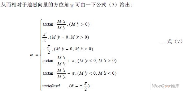 為了獲得系統(tǒng)相對于當?shù)氐卮畔蛄康姆轿唤牵枰褂肕R 傳感器的三個輸出Mx, My, Mz 。當系統(tǒng)置于水平狀態(tài)時(俯仰角和橫滾角都為0)時,方位角ψ 可以由公式(4)直 接給出,但是在大多數(shù)情況下,系統(tǒng)并不是工作在水平狀態(tài),此時地磁場的豎直分量將會影 響Mx 和My 的值,因此不能直接由公式(4)獲得相對于地磁向量的方位角。為了在所有 情況下都能獲得正確的方位角,必須將俯仰角和橫滾角考慮在內(nèi),即必須通過以俯仰角和橫 滾角為參數(shù)的坐標變換,將測得的(Mx, My, Mz)向量變換為與載體坐標系有相同方位角的 水平坐標系下的向量(M’x , M’y, M’z),其變換矩陣如公式(5)。