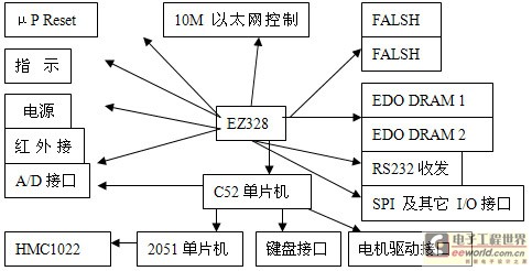 本文的課題背景是一個(gè)機(jī)器人玩具的控制系統(tǒng)設(shè)計(jì),主芯片采用的是以摩特羅拉公司的MC86EZ328芯片,只完成與通信、運(yùn)算等有關(guān)的主要操作,在沒有操作時(shí),由運(yùn)行于其上的操作系統(tǒng)uClinux來維護(hù)。對(duì)于所有與EZ328的核心運(yùn)算、控制、通信、操作無關(guān)的外圍設(shè)備的維護(hù)和控制都通過一塊AT89C52來完成,它與EZ328的底層通信協(xié)議為同步串口協(xié)議(SPI),在AT89C52中由軟件來實(shí)現(xiàn)。C52包含的部件主要是A/D轉(zhuǎn)換器,鍵盤接口,電機(jī)驅(qū)動(dòng)模塊。硬件結(jié)構(gòu)電路圖如下圖1: