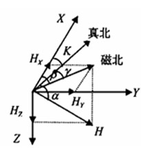 HMC的輸出電壓為磁場強(qiáng)度為0時(shí)傳感器的輸出。所以當(dāng)U0為0時(shí), Uout正比于磁場強(qiáng)度B。如圖4,假設(shè)機(jī)器人處于水平面上,X為機(jī)器人行進(jìn)方向,Y為水平面上垂直X的方向向右(即X順時(shí)針轉(zhuǎn)90),地里北極方向和地磁北極方向如圖所示。H為地磁場,Hx、Hy分別是H在X、Y方向的水平分量, β為機(jī)器人行進(jìn)方向和地磁北極方向的夾角, γ為地磁北極和地理北極方向的夾角,K就是機(jī)器人行進(jìn)方向與地理北極方向之間的夾角,也就是我們最終要求的角度。(此處的β、γ、 K都是由前者出發(fā)順時(shí)針到達(dá)后者的角度)由圖可明顯看出,K= β-γ。而在地球上不同方位的γ可查表得出,所以關(guān)鍵就是求得 。由磁阻傳感器可以得出Hx、Hy,(此處忽略了機(jī)器人在Z軸方向的傾斜,所以二維傳感器就夠用了),