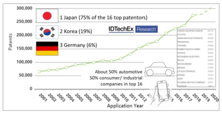 實(shí)際上,傳感器技術(shù)的創(chuàng)新正在發(fā)展。市場分析師估計(jì),已針對汽車?yán)走_(dá),LiDAR,生物傳感器以及印刷和柔性傳感器等領(lǐng)域的應(yīng)用授予了80多項(xiàng)新專利。日本名列前茅,占16個頂級專利接受國的四分之三。三星電子是前五名中唯一的非日本公司,依次為佳能,豐田,松下和東芝。