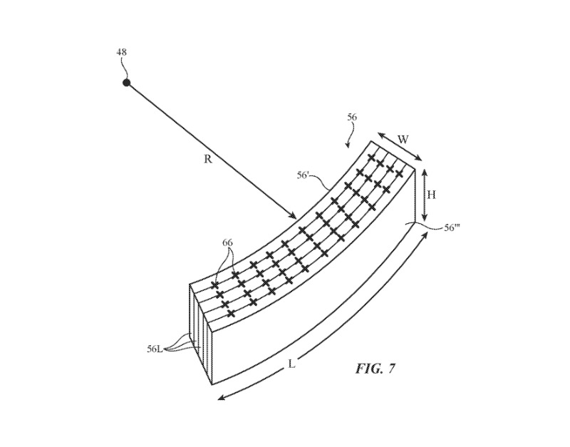 這是關(guān)鍵部分,這種光學傳感器可能會被布置并彎曲,以占用盡可能少的空間。蘋果公司說:“每個光控部件都可以由一疊層壓彎曲的光控膜形成。” “用于堆疊的光控膜可以使用具有彎曲表面的層壓工具壓制成所需的彎曲形狀。”