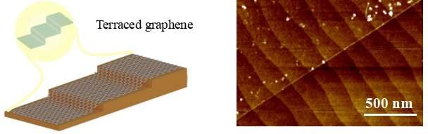 圖顯示(左)梯形單層石墨烯形成的概念。這類似于亞洲廣泛用于農(nóng)業(yè)的梯田稻田。(右)在鈦酸鍶(STO,左上方)和裸露的STO基板(右下方)上石墨烯的梯形形態(tài)的原子力顯微鏡圖像。
