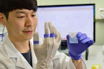 借助KIST后硅半導體研究人員開發(fā)的轉移印刷技術,他們正在進行實驗,通過在實驗手套的頂部安裝高性能傳感器來檢測手指的運動。圖片來源:韓國科學技術學院(KIST)