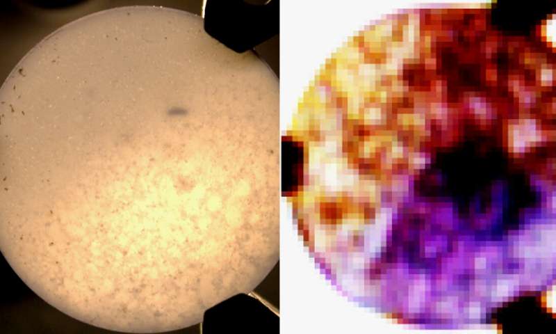 一項(xiàng)新的成像技術(shù)可快速測量固體的化學(xué)成分。樣品藥丸的常規(guī)圖像顯示在左側(cè)。在右側(cè),以太赫茲頻率觀察同一表面會(huì)發(fā)現(xiàn)各種成分具有不同的顏色。這樣的圖像將有助于藥品制造中的質(zhì)量控制和開發(fā),以及醫(yī)學(xué)診斷和治療。圖片來源:Sterczewski等。