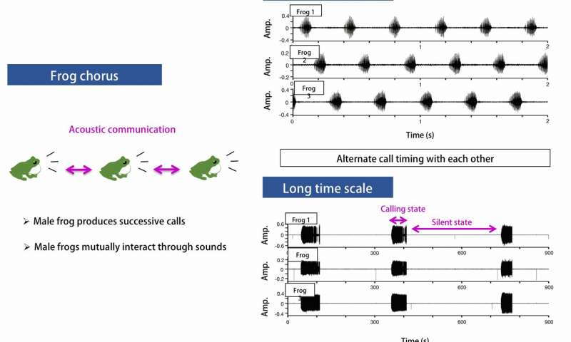 在觀察到的青蛙三重奏中,有時(shí)還會(huì)在集體沉默和合唱之間交替出現(xiàn)。避免重疊是一致的(確定性的),而后面的集體召集則更具多樣性(隨機(jī)的)。該模式的另一個(gè)實(shí)用工具是它如何巧妙地使青蛙從它們的呼喚中休息,這需要大量的能量。