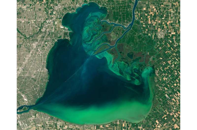 伊利湖藻華的衛(wèi)星圖像。