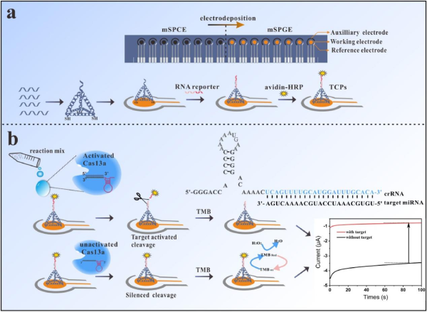 近日,中國(guó)科學(xué)院上海微系統(tǒng)與信息技術(shù)研究所研究員宓現(xiàn)強(qiáng)課題組構(gòu)建了一種基于CRISPR的電化學(xué)傳感器(CRISPR-E)。該研究將DNA四面體框架結(jié)構(gòu)修飾在印刷電極上,進(jìn)一步與RNA探針雜交,最后連接HRP分子構(gòu)建TCP探針;通過(guò)將電化學(xué)技術(shù)、DNA四面體框架結(jié)構(gòu)與CRISPR技術(shù)相結(jié)合,利用Cas 13a在crRNA的引導(dǎo)下識(shí)別靶RNA后能夠?qū)捂淩NA表現(xiàn)出“附帶切割”能力,實(shí)現(xiàn)了對(duì)miRNA的無(wú)擴(kuò)增、高靈敏度檢測(cè)。由于整個(gè)反應(yīng)過(guò)程可以在電極上實(shí)現(xiàn),因此有望推動(dòng)miRNA的及時(shí)快速(POC)檢測(cè)。