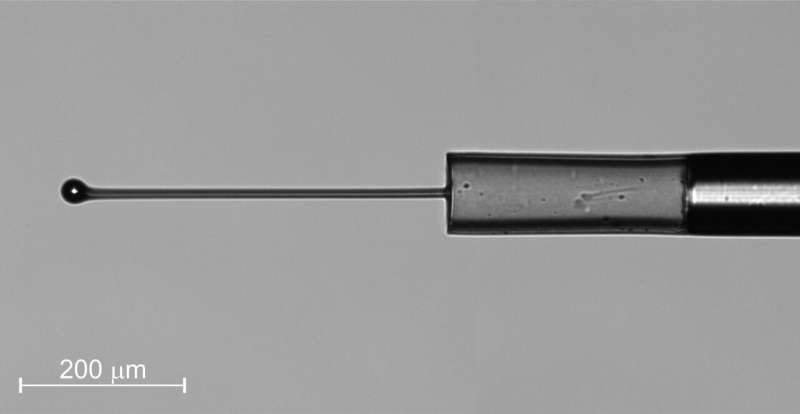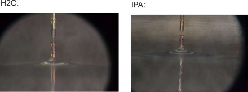 研究人員使用新傳感器通過(guò)測(cè)量從水(左)和異丙醇(右)中取出微型圓柱體時(shí)的回縮力來(lái)測(cè)量液體的表面張力。圖片來(lái)源:馬里博爾大學(xué) Denis Donlagic