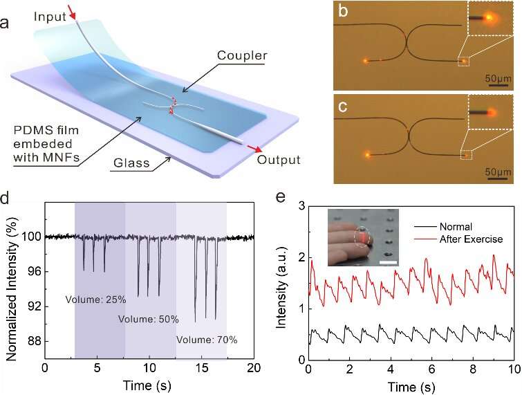 基于MNF耦合器的應變傳感器工作原理 (a) 應變傳感器結(jié)構示意圖。(b), (c) MNF 耦合器在間隙略微變化之前和之后的光學顯微照片,分別。MNF的直徑約為900nm,彎曲半徑為50μm。(d) 設備對三種不同音量的節(jié)拍器的響應。(e) 在正常情況下(每分鐘 72 次)和運動后(每分鐘 85 次)測量實時指尖脈搏波。插圖顯示了傳感器連接到指尖以測試指尖脈搏的照片,比例尺為 1 厘米。圖片來源:Compuscript Ltd