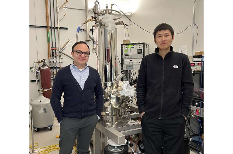 物理學(xué)家Jairo Velasco Jr.(左)和研究生Zhehao Ge在加州大學(xué)圣克魯斯分校的Velasco實(shí)驗(yàn)室。在他們身后是他們用來(lái)創(chuàng)建和研究石墨烯量子點(diǎn)的掃描隧道顯微鏡(STM)。