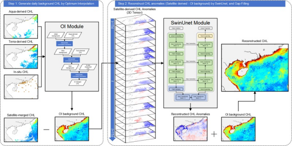 該研究結(jié)合最優(yōu)插值(OI)方法和深度學(xué)習(xí)網(wǎng)絡(luò)框架(SwinUnet),構(gòu)建了基于數(shù)據(jù)異常預(yù)期方差的深度學(xué)習(xí)模型——OI-SwinUnet。該方法利用最優(yōu)插值,基于空間鄰域信息,融合衛(wèi)星觀測和現(xiàn)場觀測數(shù)據(jù),并利用SwinUnet對大區(qū)域長時(shí)序的遙感觀測時(shí)間序列數(shù)據(jù)進(jìn)行多尺度特征學(xué)習(xí),重建缺失的葉綠素a濃度數(shù)據(jù),進(jìn)而獲得南海區(qū)域逐日1km海表葉綠素產(chǎn)品。