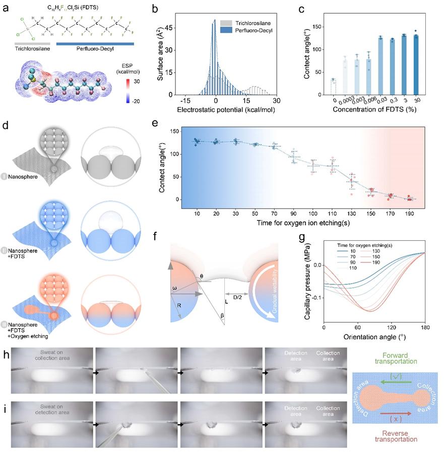 為了實現(xiàn)汗液自動收集和輸送功能,探究了旋涂不同濃度FDTS以及氧離子刻蝕時間對納米陣列表面接觸角的影響。當納米陣列未旋涂FDTS時,表面接觸角約為32.32°,此時納米陣列表面不親水也不疏水。而經過FDTS旋涂后,納米陣列表面接觸角迅速增大,形成高度疏水狀態(tài)。隨后,納米陣列表面選擇部分區(qū)域進行氧離子刻蝕,將其轉化為高親水性表面,從而實現(xiàn)納米陣列表面的階梯式潤濕性。從通道的正/反方向模擬汗液采集運輸,由于汗液通道的收集區(qū)與檢測區(qū)存在形狀和大小上的差異,液體只會正向從收集區(qū)自動運輸?shù)綑z測區(qū),驗證通道自動單向輸送汗液的能力。