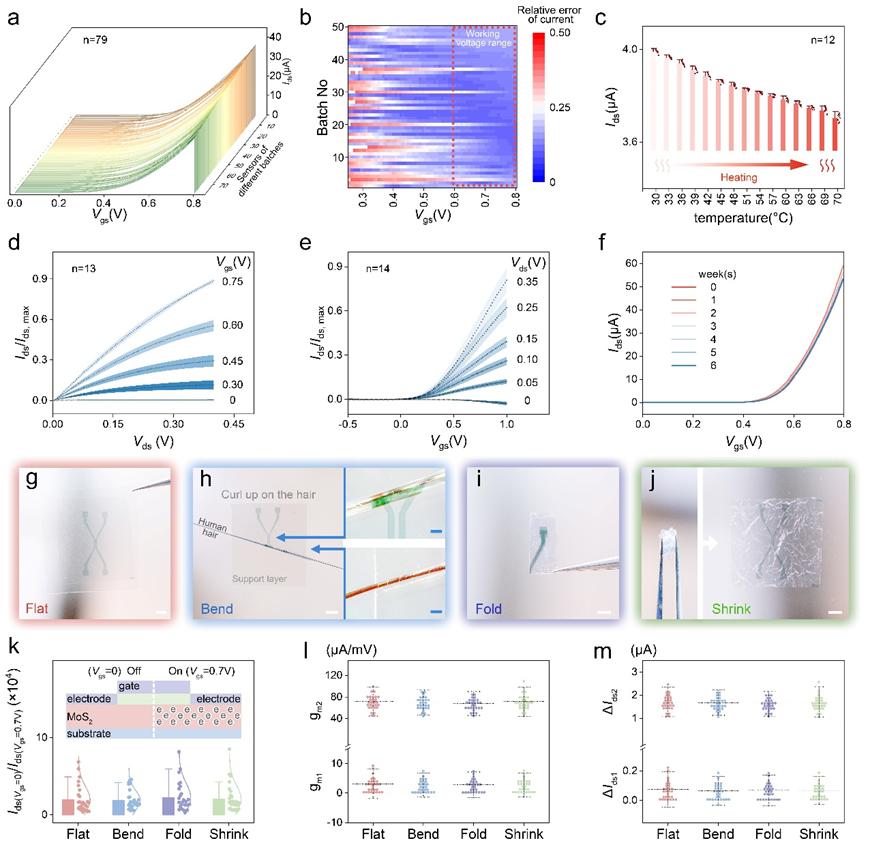 為了評估不同批次NM-FET的性能穩(wěn)定性,測試多個批次場效應管傳感器的轉移特性曲線,發(fā)現(xiàn)其顯示出較為良好的一致性。為驗證人體溫度變化對NM-FET的影響,場效應管測試了溫度范圍30°-70°的電學性能,其轉移特性曲線的電流只從3.99 μA降低到3.7 μA。NM-FET在室溫非密封條件下存儲六周,每周測試NM-FET的轉移特性曲線,其電流變化率僅為4.42%。以上結果說明制造批次,溫度以及長時間存儲對NM-FET系統(tǒng)的電學性能影響較小。為了驗證NM-FET柔性基底的抗形變能力,利用彎曲、折疊和皺縮來測試每次變形后NM-FET的電學特性變化,結果表明NM-FET在經歷形變后仍能保持較高的電學穩(wěn)定性。