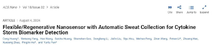 日前,哈爾濱工業(yè)大學的潘昀路、胡平安教授團隊,設計開發(fā)了一種具有自動汗液輸送、雜質隔離和可重復使用功能的高靈敏度柔性監(jiān)測系統(tǒng)——納米陣列二硫化鉬場效應管(NM-FET)。該系統(tǒng)將具有逐步潤濕性表面的納米陣列和用Nafion/適配體修飾的場效應管傳感器進行集成,該系統(tǒng)可檢測真實汗液中10fM~1nM范圍變化的TNF-α蛋白濃度。相關工作以“Flexible/Regenerative Nanosensor with Automatic Sweat Collection for Cytokine Storm Biomarker Detection”為題發(fā)表在《ACS Nano》,并被選為當期封面。文章共同第一作者為哈爾濱工業(yè)大學機電工程學院助理研究員黃聰、2023級博士生楊煒嵩、2021級博士生王昊、2018級博士生黃穗楚。