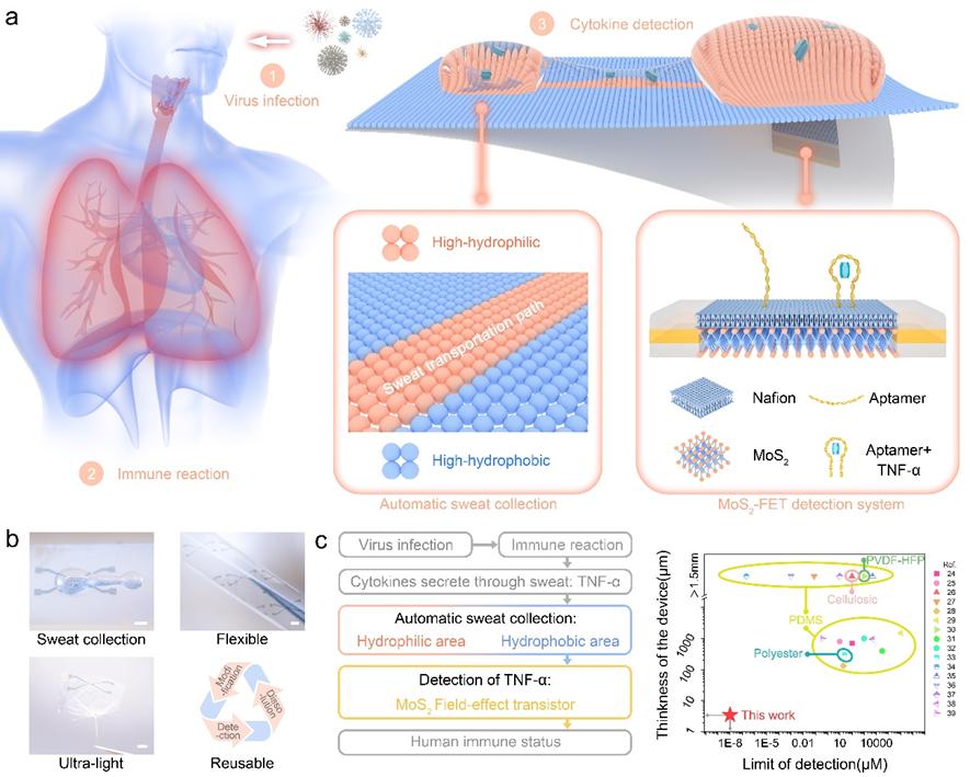 細胞因子是協(xié)調人體免疫反應的關鍵蛋白,廣泛存在于血液和組織液等內分泌液以及唾液和汗液等外分泌液中,是臨床評估患者健康狀況的重要生物標志物。在呼吸系統(tǒng)疾病中,病毒通過呼吸道進入人體后,免疫系統(tǒng)分泌各種調節(jié)炎癥的細胞因子,能夠刺激、集中和擴增免疫細胞。TNF-α作為一種典型的促炎類型細胞因子,在人體的免疫反應中尤為重要。通過監(jiān)測汗液中的TNF-α濃度,可以有效地評估機體的免疫狀態(tài)。傳統(tǒng)的檢測方法,例如免疫熒光法和酶聯(lián)免疫吸附法,往往需要復雜的操作和較長的時間進行檢測,限制了其大規(guī)模應用。因此,發(fā)展可穿戴傳感器,實現(xiàn)對于痕量蛋白的檢測,成為新的研究熱點;诙S材料(如MoS2和石墨烯)的場效應晶體管傳感器因其無標記、快速響應和高靈敏度等優(yōu)點而備受關注,在人體代謝物和離子檢測方面得到了初步應用。然而,在真實的檢測中,人體外分泌液(如汗液)中雜質分子的存在會嚴重干擾痕量蛋白的有效檢測。因此,開發(fā)能夠直接檢測未稀釋汗液中細胞因子的可穿戴設備成為臨床研究的焦點。