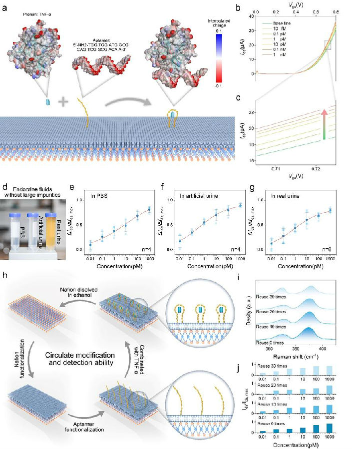 在真實檢測中,人體外分泌液中雜質分子的存在會嚴重干擾蛋白的有效檢測。為了證實該檢測系統(tǒng)在不同溶液中的檢測能力,NM-FET分別在磷酸鹽緩沖溶液(PBS)、人工尿液和真實尿液中檢測,均表現(xiàn)出較為出色的檢測能力。適配體和蛋白結合后通常無法自行分離,因此大多數(shù)基于適配體檢測的傳感器是一次性的。而如果可將傳感區(qū)域進行回收處理,即可實現(xiàn)傳感器的重復利用。由于Nafion可溶于酒精,將使用過的NM-FET浸入酒精,MoS2通道表面的Nafion溶解,即可恢復到原始MoS2通道狀態(tài)。隨后使用Nafion和適配體進行另一輪修飾,可恢復NM-FET的檢測能力。對NM-FET進行30次循環(huán),每10次循環(huán)后測量MoS2表面的拉曼光譜,并使用修飾后的NM-FET進行TNF-α濃度檢測。結果表明NM-FET可循環(huán)使用30次檢測周期,這有效提高了檢測系統(tǒng)的資源利用效率。
