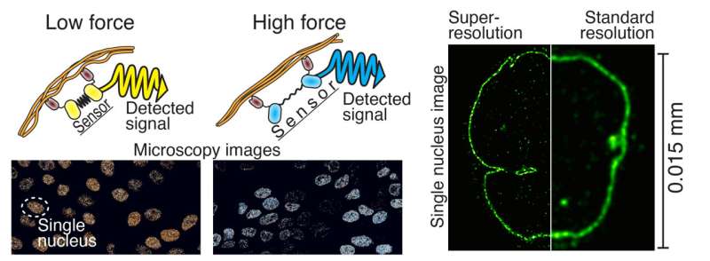 左側(cè)細(xì)胞內(nèi)力傳感器的作用原理。熒光蛋白(黃色和青色)源自水母,而類似橡皮筋的部分(黑色)利用了蜘蛛網(wǎng)蛋白。目標(biāo)蛋白結(jié)合抗體(深棕色)源自羊駝。右側(cè)圖像是超分辨率顯微鏡與傳統(tǒng)顯微鏡對(duì)細(xì)胞核成像的對(duì)比。圖片來源:蒂穆・伊哈萊寧,坦佩雷大學(xué)