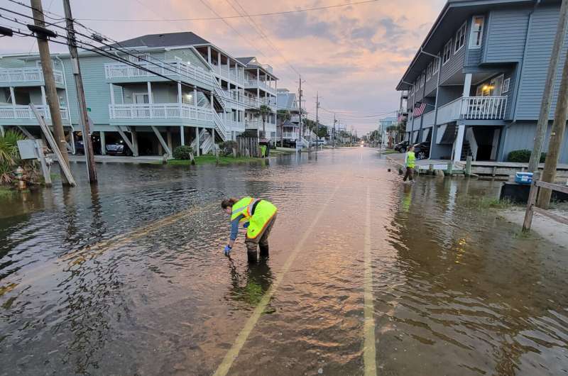 一項(xiàng)新研究發(fā)現(xiàn),沿海洪災(zāi)發(fā)生頻率遠(yuǎn)超此前認(rèn)知,且廣泛使用的利用潮汐數(shù)據(jù)捕捉洪災(zāi)的方法存在重大缺陷。圖片為研究人員在北卡羅來(lái)納州卡羅來(lái)納海灘采集洪水樣本。圖片來(lái)源:晴日洪水項(xiàng)目(Sunny Day Flooding Project)
