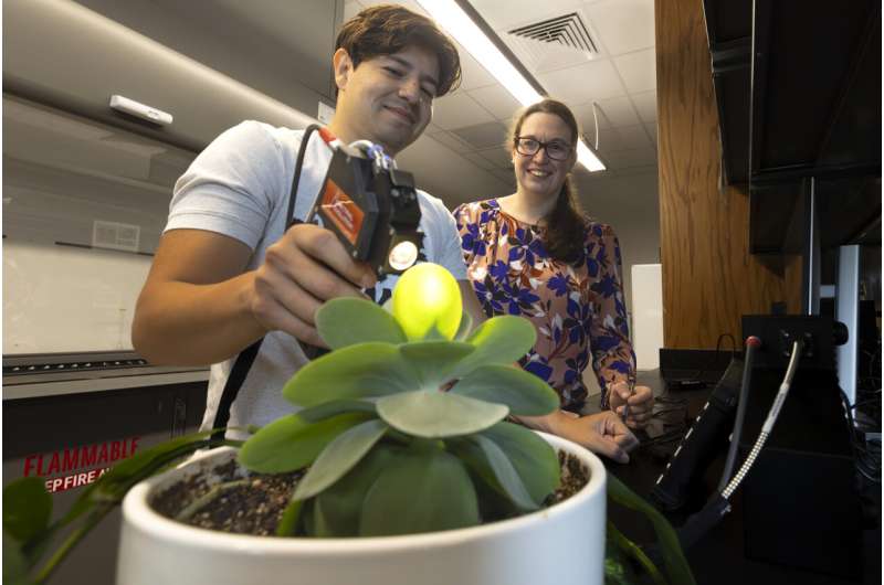 馬里奧・索托(左),作物、土壤與環(huán)境科學(xué)系碩士研究生,與阿肯色大學(xué)農(nóng)業(yè)分部及戴爾・邦珀斯農(nóng)業(yè)、食品與生命科學(xué)學(xué)院精準(zhǔn)農(nóng)業(yè)助理教授奧雷莉・龐塞特,共同展示一項(xiàng)用于測(cè)量除草劑對(duì)植物作用效果的研究設(shè)備。(圖片來源:阿肯色大學(xué)農(nóng)業(yè)分部)