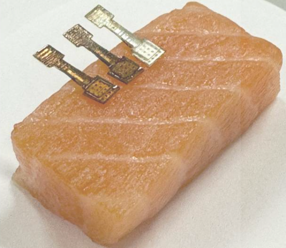 為了制造傳感器,團(tuán)隊(duì)制作了一個(gè)四乘四的微針陣列,并涂覆了專用的金納米顆粒和一種能分解HX的酶。傳感器被壓入魚(yú)體表面,并由微針固定。隨著酶分解HX,魚(yú)體內(nèi)的電勢(shì)發(fā)生變化,傳感器會(huì)測(cè)量并解讀這些變化。