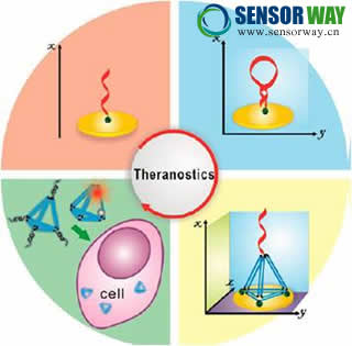 生物分子探針在傳感界面上的組裝過程很大程度上決定了生物傳感檢測(cè)的性能。如何調(diào)控生物分子在界面上的密度和取向,減少生物分子與界面的非特異性吸附并避免界面分子間的側(cè)向作用力則已成為該領(lǐng)域的挑戰(zhàn)性問題之一。針對(duì)這一問題,樊春海課題組對(duì)DNA分子在宏觀和納米界面上的組裝過程進(jìn)行了系統(tǒng)研究。由于DNA是一種軟物質(zhì),常規(guī)使用的一維單鏈探針容易產(chǎn)生鏈間糾纏而聚集。2003年發(fā)展出了具有一定剛性的二維結(jié)構(gòu)DNA探針,在一定程度上解決了這一問題(Fan et al. PNAS 2003, 100, 9134) ,并在DNA和核酸適配體檢測(cè)方面展現(xiàn)出明顯的優(yōu)越性。近年來,通過引入DNA納米技術(shù)發(fā)展出剛性的三維結(jié)構(gòu)DNA探針,實(shí)現(xiàn)了DNA探針之間距離的精確調(diào)控。這為構(gòu)筑有序的生物分子界面提供了新的途徑,提高了界面生物識(shí)別能力,進(jìn)而顯著提升了生物傳感器的檢測(cè)能力。在這一新型生物傳感平臺(tái)上深入研究了界面識(shí)別和電子傳遞等物理化學(xué)機(jī)制,并實(shí)現(xiàn)了核酸、抗原和小分子的超高靈敏檢測(cè),相關(guān)結(jié)果相繼在JACS, Angew. Chem.,Adv. Mater., Sci. Rep.等雜志發(fā)表。