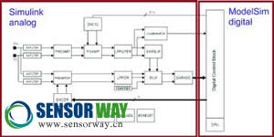 確定磁場之后是傳感器系統(tǒng)仿真。AMR 元件的電阻變化是各向異性磁阻效應(yīng)的直接結(jié)果。這樣,磁場仿真的結(jié)果會導(dǎo)致代表信號處理中輸入信號的電阻發(fā)生變化。對模擬前端進行建模可采用 Simulink。這種行為模型是概念設(shè)計的產(chǎn)物,標(biāo)志著產(chǎn)品開發(fā)的起點。每個 Simulink 塊對應(yīng)一個模擬信號處理組件,例如放大器或過濾器。但是,尚未考慮模擬組件的控制部分,這由數(shù)字系統(tǒng)實現(xiàn)。HDL 設(shè)計則仿真通過數(shù)字方法實現(xiàn)的功能,而且在完成產(chǎn)品開發(fā)之后就會最終成形。因此,整體系統(tǒng)仿真是 Simulink 對模擬組件的行為模型以及ModelSim 對 HDL 設(shè)計的共同仿真(圖8)?赏ㄟ^仿真從概念階段順利過渡到HDL 設(shè)計及后續(xù)階段。在共同仿真中,可用 ModelSim 中部署的 Verilog 代碼逐漸代替 Simulink 參考模型,從而可逐項驗證 HDL 設(shè)計?沙掷m(xù)進行此過程,直到在 Verilog 中實現(xiàn)整個數(shù)字部件,而模擬系統(tǒng)部件仍保持為 Simulink模型。此工具組合也已證明對 IC 評估同樣有用。自始至終使用這種工具可以更容易理解 IC 行為,并可創(chuàng)建用來分析和解釋任何錯誤的框架。這些工具的主要好處在于,能夠更快速、更準(zhǔn)確地答復(fù)客戶的查詢,以及更好地了解與環(huán)境條件相關(guān)的傳感器功能。