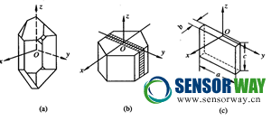石英晶體(Quartz Crystal)是二氧化硅無水化合物,分子式為Si02,是各向異性的材料,通常用直角坐標軸來表征它的方向性。典型的石英晶體外形和直角坐標軸,X切割的石英晶體片如圖1所示。Z軸是石英晶體的對稱軸,在垂直于Z軸的平面上,通過相對兩棱的直線叫X軸,由于石英晶體呈六角棱形,因此有三個X軸。與X軸和Z軸都垂直的是Y軸。X軸稱為電軸,Y軸稱為中性軸(或機械軸)Z軸稱為光軸。通常所說的X(或Y)切割,就是切割出來的石英晶體片的兩個平面都與X(或Y)軸相。