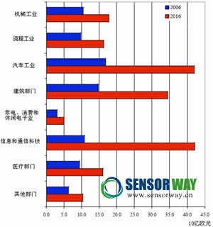 生產(chǎn)過(guò)程、現(xiàn)代汽車、創(chuàng)新的醫(yī)療設(shè)備、智能供電系統(tǒng)和建筑技術(shù)都離不開(kāi)傳感器,傳感器滲透領(lǐng)域越來(lái)越多,并不斷開(kāi)拓新的應(yīng)用領(lǐng)域。圖1是2006年和2016年全球民用傳感器主要應(yīng)用領(lǐng)域情況。在2006年傳感器816億歐元的市場(chǎng)規(guī)模中,12.9%的需求來(lái)自機(jī)械行業(yè),12.0%來(lái)自流程工業(yè),20.6%來(lái)自汽車行業(yè)(包括飛機(jī)、船舶和軌道車輛),18.2%來(lái)自建筑行業(yè),3.8%來(lái)自家電和消費(fèi)電子業(yè),13.3%來(lái)自信息和通信行業(yè)。隨著智能移動(dòng)通信技術(shù)和平板電腦的持續(xù)繁榮、駕駛員輔助系統(tǒng)和混合動(dòng)力電動(dòng)汽車的快速增長(zhǎng),刺激了信息和通信業(yè)、汽車行業(yè)對(duì)傳感器的急劇需求。在由INTECHNO公司預(yù)測(cè)的2016全球傳感器1844億歐元的市場(chǎng)規(guī)模中,信息和通信業(yè)、汽車行業(yè)對(duì)傳感器的需求最高,分別高達(dá)22.9%和22.8%,其次依次是建筑業(yè)(占18.1%)、機(jī)械工業(yè)(占9.7%)、流程工業(yè)(占8.9%)、醫(yī)療部門(占8.8%)、家用電器和消費(fèi)電子業(yè)(占2.7%)。此外,環(huán)保、基礎(chǔ)設(shè)施等其他部門對(duì)傳感器的需求也日益增長(zhǎng)。