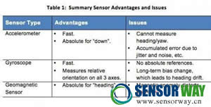 如前所述,加速度計、陀螺儀和地磁傳感器每個都有各自的優(yōu)缺點。下表1總結(jié)了每種傳感器在運動跟蹤方面的主要優(yōu)勢和問題。