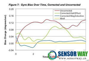 前面的圖3給出了隨時間變化的陀螺儀零偏,它代表了長期航向漂移的根本原因。在9軸傳感器融合系統(tǒng)中,加速度計和磁力傳感器建立了一個長期的基準(zhǔn)用于校正零偏變化。但磁力傳感器讀數(shù)中的噪聲以及磁力傳感器類型對零偏校正的效果有顯著的影響。圖7再次顯示了隨時間改變的零偏變化,但這次畫出了未校正的、用霍爾效應(yīng)傳感器校正的、用永磁感應(yīng)傳感器校正的和理想輸出的圖形。值得注意的是,所用的傳感器融合算法對兩種傳感器來說是相同的。