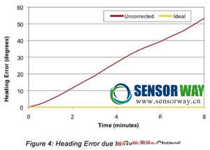 圖4:由于陀螺儀零偏變化引起的航向誤差。