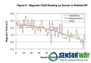 下圖顯示了地磁傳感器在磁場強度為2.4mT數(shù)量級的固定位置旋轉(zhuǎn)時輸出的磁場讀數(shù)。在圖5中,傳感器旋轉(zhuǎn)了整整360°,而在圖6中,傳感器從0°旋轉(zhuǎn)到90°。這兩張圖都繪出了霍爾效應(yīng)傳感器、永磁感應(yīng)傳感器和理想傳感器的試驗數(shù)據(jù)。
