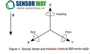 圖1:重力矢量和圍繞軸的航向、傾斜和滾動。