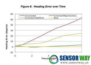 永磁感應(yīng)傳感器可以更好地控制零偏漂移的能力將顯著改善隨時間變化的航向性能,如圖8所示。我們在這里可以看到,與未校正系統(tǒng)相比,使用霍爾效應(yīng)傳感器的傳感器融合系統(tǒng)的長期性能在8分鐘內(nèi)減少航向誤差的效果高出2倍。但使用永磁感應(yīng)傳感器的傳感器融合系統(tǒng)與未校正系統(tǒng)相比可以減少航向誤差一個數(shù)量級,比基于霍爾效應(yīng)磁力傳感器的系統(tǒng)好5倍。