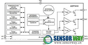圖 2:ADT7410 將三角積分轉(zhuǎn)換器與溫度傳感器集成在一起,可實現(xiàn)低功耗可配置分辨率。