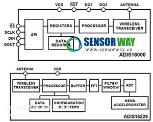 ADIS16000 和 ADIS16229 的這種組合構(gòu)建了一個感應(yīng)網(wǎng)絡(luò),其中 ADIS16000 提供網(wǎng)關(guān)功能,用于管理由 ADIS16229 傳感器單元組成的網(wǎng)絡(luò)。