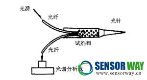 用來測定活體組織和血液值pH光纖光譜傳感器示意圖,如圖3所示。其工作原理是利用發(fā)射光、透射光的強度隨波長的分布光譜來進行測量。這種傳感器將兩根光纖插入可透過離子的纖維素膜盒中.膜盒內(nèi)裝有試劑,當(dāng)把針頭插入組織或血管后,體液滲入試劑,導(dǎo)致試劑吸收某種波長的光.用光譜分析儀測出此種變化,即可求得血液或組織的pH值。